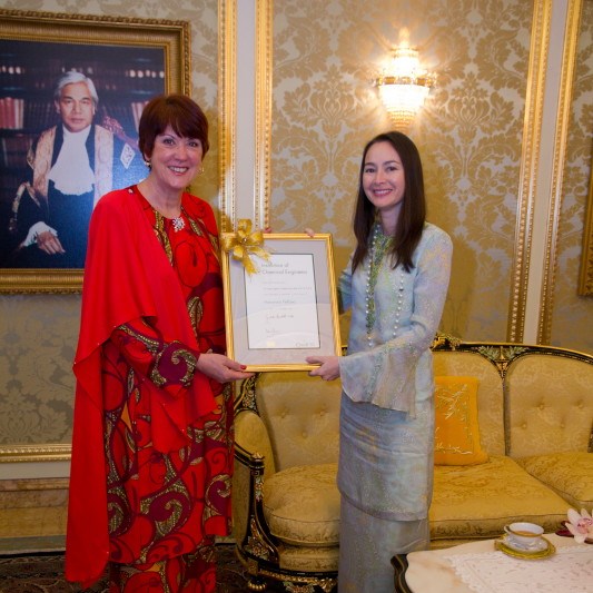 In April 2014 we presented Honorary Fellowship to HRH Raja Puan Besar of Perak Tuanku Zara Salim, D.K.S.A, D.K.A. at the royal palace in Malaysia (pictured below).