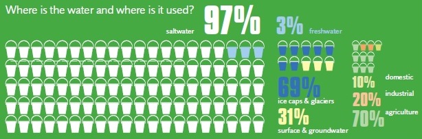An estimated 70 per cent of all extracted freshwater is used for agriculture alone with 20 per cent being used in the production and processing industries (including food processing), leaving just 10 per cent for domestic use (e.g. drinking water, sanitation).